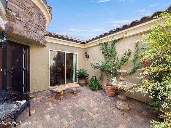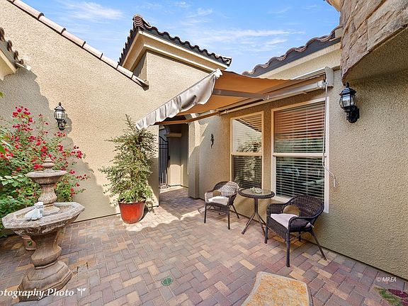 SID PAID. GARAGE has A/C and HEAT. Large 2 1/2 car garage has room for a golf cart and/or razor. Beautifully designed "outdoor living area" has an extended brick paver patio complimented by an extended pergola creating a larger entertaining area. Lush landscaping surrounds the backyard creating privacy and some southern VIEWS of the mountains. Front courtyard is gated and has a retractable awning for year round enjoyment. Brick paver driveway and sidewalk create an exquisite curb appeal for this home. Exterior of the home was just painted in 2021. Crown molding - granite counters in the kitchen - stainless steel appliances - tiled floors in entryway - living room - dining area - kitchen - laundry and bathrooms are just more of the excellent upgrades in this home. Dining area has a sliding door out to the covered back patio for ease in entertaining. Master Bedroom has nice large windows bringing in plenty of natural light. Washer and dryer are also included in the sale. Garage is insulated and has storage cabinets along with a workbench and peg board. NO NEED TO WAIT 9 MONTHS TO BUILD.....MOVE-IN READY....Sellers will be moved out by Nov 19th.