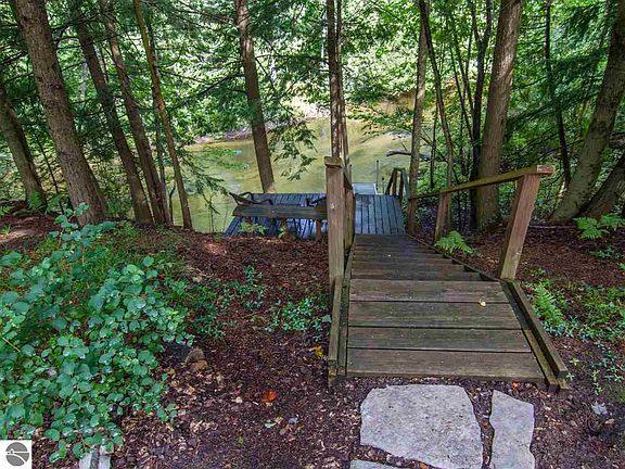 Perhaps the best part of this cottage is that you get the feeling that you have brought nature right inside. Numerous windows assure a constant view of the beauty that surrounds you in this 3 bedroom 2 bath up north retreat, nestled upon 103' of the Betsie River. Convenient stairs lead you down to your private dock with a tranquil deck conveniently located halfway down the stairs. The expansive two-level deck adjacent to the home, surrounded by fragrant low maintenance perennial gardens and wood chip walkways, is a wonderful spot to enjoy your morning coffee. A decorative and functional fire pit is awaiting your s'mores and stories of that big fish that got away. Generous kitchen space with an adjacent dining area, accented with antique copper light fixtures. Master and 2nd bedroom are located on the main floor, as well as master and guest bathrooms. The second floor offers a loft area, providing nearly 400 additional square feet of family gathering space, as well as the 3rd bedroom, which was added as part of the garage addition. Speaking of the two car garage, it's not often that garage doors make a statement all by themselves, but these truly do. This lodge-style home is simply a must see. Option to include a complimentary one-year FOUR SEASONS CLUB family membership to Crystal Mountain.