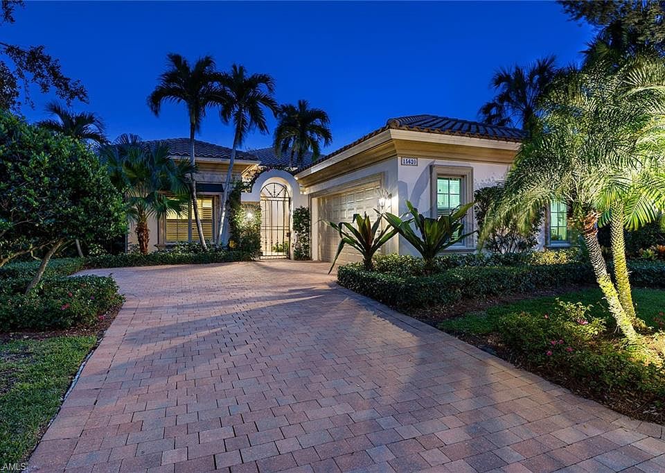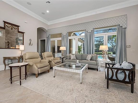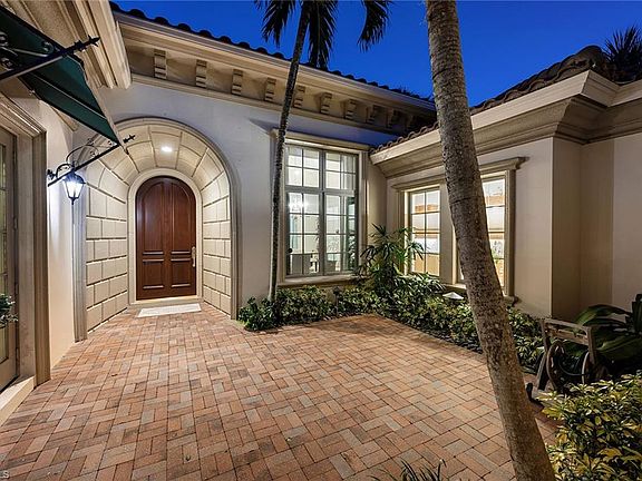 This home includes an immediate golf membership opportunity! A private courtyard welcomes you to this charming villa boasting expansive sparkling lake views. Immediately upon entering, you will enjoy the bright and welcoming atmosphere. Enjoy volume ceilings, crown moldings, extensive windows adorned with plantation shutters, arched passageways, and French doors in the expanded great room open to the covered outdoor living area creating a seamless transition from indoor to outdoor living spaces. The master suite is a tranquil retreat with a seating area in the master bedroom alongside the oversized windows. Granite-topped vanities, custom mirrors, a soaking tub and separate shower are found in the master bathroom. The custom pool is one of the largest in all of Villoresi with a relaxing spill-over spa. Additional features include an air-conditioned garage, Carrier Infinity AC system, a tankless water heater and water filter system. Long sparkling lake views create the perfect tropical backdrop for this magnificent villa residence. Located in the award-winning community of Mediterra offering 36-holes of Tom Fazio championship golf, a beach club, bocce ball, pickleball and more.