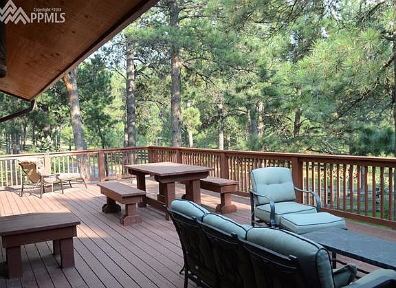 Don't look at year built! Total remodel. Unbelievable Black Forest location! End of quiet cul-de-sac w/healthy, mature ponderosas, beautiful entry with wood fencing around entire five acres. Enter into a serene world of a fabulous true customized home. 4-5 bedrooms possible/5 baths, fabulous kitchen w/ custom beetle kill cabinetry. Walls of glass surround the rooms on the west/south side w/ new windows/sliders opening to expansive redwood decking. Double Masters on main. Parklike setting with a spa amenities. A must see Massive ecking overlooking gorgeous landscaping and the Forest at its very best.The three decks are huge and two have built-in seating. Three master bedrooms, two on main, one below with sliders to the outside, one additional bedroom on main used as an office. An additional bedroom below possible with small remodel (taking out the dry sauna) Wet sauna, dry sauna, enclosed hot tub/double H2O's, 2 a/c, 2 furnaces/ central vac, double septics/fields, additional three car, heated garage, with 2 stall barn below, additional hay barn and loaf shed, riding area. Totally mitigated trees. Double staircases (elevator possible) with access to each end of the home, large exercise area in basement complete with fountain. Custom lighting, 4 inch plank hardwood, new tile, unbelievable laundry/craft room with 1/2 bath and walkout. Stacked stone and walkways Wonderful!!