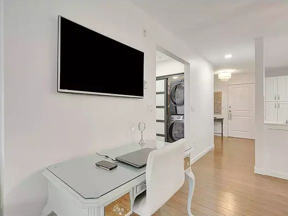 One of the very few that have private entry off the deck making this unit more like a townhome. Large 152 s.f. sundeck with lots of room for entertaining. Upgraded laminate wood flooring, beautiful white wood kitchen cabinetry, in-suite laundry (full-size machines) and Zebra blinds