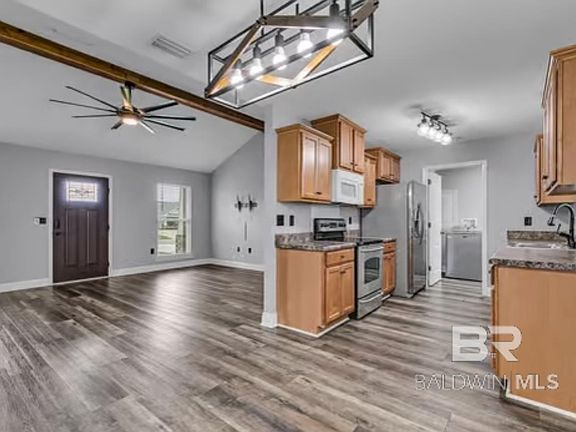 - Included: Dishwasher, Dryer, Microwave, Electric Range, Refrigerator w/Ice Maker, Washer
