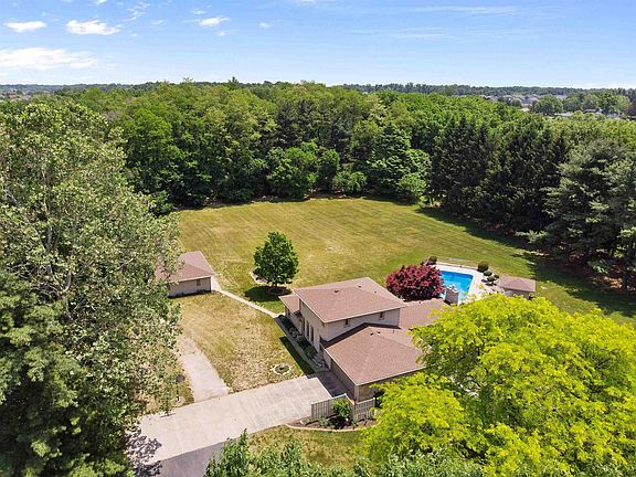 ONE OWNER HOME and ONE TIME OPPORTUNITY to own a home with 7 Acres in the heart of Northwest Allen County Schools and the Pufferbelly Trail! Private driveway leads you to this remarkable property that features over 2100 sq. ft. plus a finished basement. Modern double front doors open into the foyer, living room with stone fireplace, and formal dining room. Spacious kitchen with wood flooring and an abundance of cabinets. The primary bedroom is located on the main level and features an open bath area complete with a Jacuzzi (heated) tub, crown molding with lighting. Quillen replacement windows in home (except in formal dining area). Additional features include: Geothermal Water Furnace (owners have serviced twice a year), newer humidifier, 2 water heaters, bladder tank (2015), ROOF (2017) tear off on house and all buildings, front doors (2022) and plaster walls. This property also features an IN-GROUND POOL that is heated and has a newer liner (2022) and is open and closed by Tredway Pools. Also included is a DETACHED GARAGE with finished living area complete with an updated full bath, a separate bladder tank, water heater, and electric baseboard heat. The home also features a spacious laundry room (17x6) with cabinets and sink and a separate mudroom with access from outside. Also included is a pigeon/chicken coop! The wooded acreage is also included; the seller has cut paths for walking and soon the PUFFERBELLY TRAIL will be nearby for easy access!