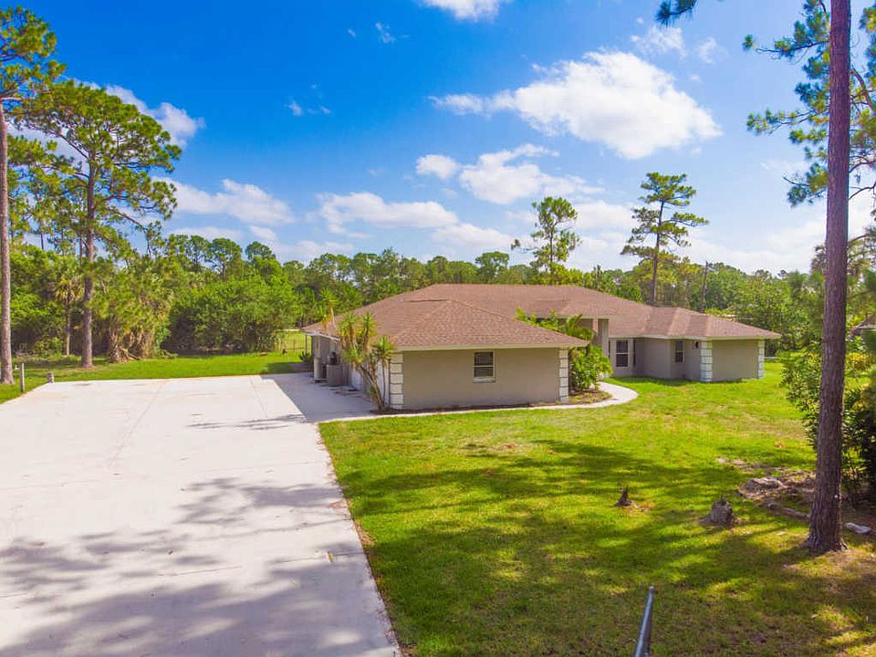 This lovely 4 bedroom 3 bath 3 car garage home is located on a dead end lot with 3+ acres that is fully fenced w/ Barn. Features included are a concrete driveway, vaulted ceilings, indoor laundry room w/cabinets, large covered and screened in patio & split bedroom floor plan. Open concept in design Family room and Kitchen with lots of cabinets, pantry, snack bar, granite, black appliances & breakfast nook. The over sized Master Suite has a sitting area, double walk in closets, dual roman shower with built in seat, tub, linen closet and separate commode area. This home and property has so much to offer the barn is currently being used as extra storage but could be converted back into a barn for horses and or livestock. Convenient to nearby community Equine center, parks & Publix