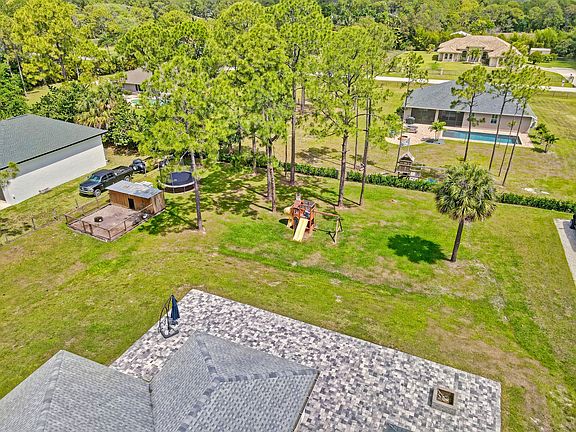 Amazing 2019 build with additional 2,000 sqft RV garage. Modern single-story 4/2 with split floorplan and open kitchen layout is fully fenced on a 1.15 acre lot with no HOA restrictions. Sodded yard with secure entrance gate and paver deck with 2 covered areas. PGT Impact windows and sliders. 2-car garage plus a detached RV garage, 2-car paved driveway and 6,100 sqft of gravel drive. Large, detached, reinforced RV garage is nearly brand new with double doors, 190 mph hurricane rating, and 150 ft of driveway from road to garage (Size: 22' high X 30' X 62'). Kitchen has granite counter tops, large breakfast bar, white Shaker soft-close cabinetry with decorative molding, undermount lighting, breakfast bar, double oven & pantry