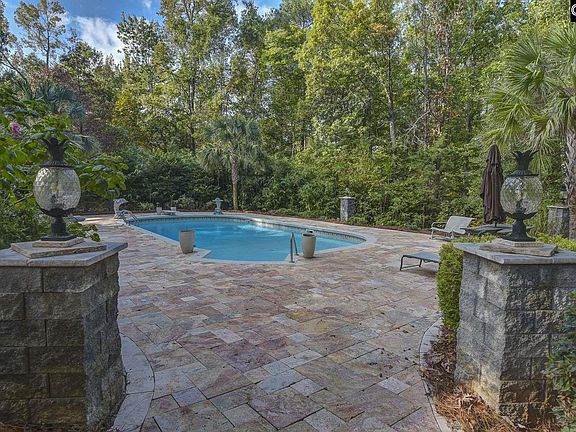 Historic replica, custom All Brick home on 6+ acres with In-ground pool. Features include a wrap around front porch and a sun room across the back side of house over looking a wooded private back yard. Large historian size dining and living areas characterized by french doors, heavy molding, book shelving, and hardwood floors. Master on main floor with 4 large bedrooms upstairs. Beautiful pool area with travertine pool decking and dolphin fountain features, landscaped with tons of wooded privacy. New roof in 2018, two 20 SEER HVAC units in 2013, Rinnai hot water heater, ELEVATOR, fireplace with wood stove insert. Long private driveway makes you feel you are out in the country but you are only 5-10 minutes from the heart of Lexington. Located across the street from Beautiful Lake Murray.
