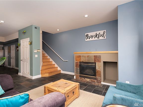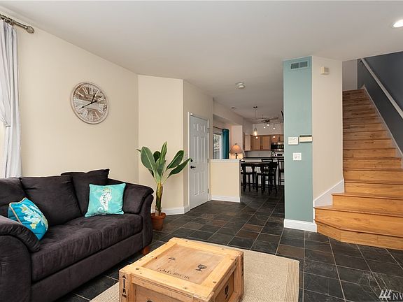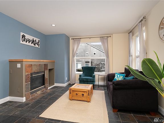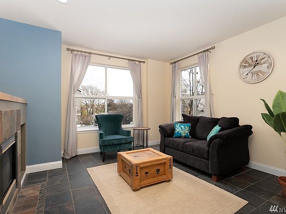 Off the beaten path, a short walk to the light rail, and tucked into the greenbelt of North Beacon Hill, this neighborhood townhome-style condo features a bright yet cozy living room warmed by a mantled gas fireplace. Natural slate stone spans the entire first floor into the kitchen, powder room, and dining room where glass doors make way to a patio perfect for summer BBQ's. The updated kitchen includes stainless appliances and a breakfast bar with granite countertops. A hardwood staircase leads upstairs to two baths, washer/dryer behind barn doors, a large bedroom with windows to the greenery, and a master suite with beautiful territorial & mountain views, vaulted ceilings, and double closets.