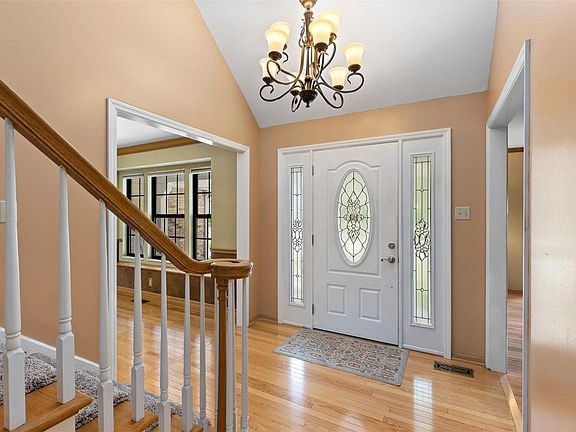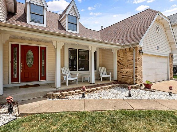 Beautiful & Located in Rockwood School District! This 1.5 Story home offers the convenience of a Main Floor Primary bedroom with luxury ensuite bathroom, walkin closet & 3 spacious bedrooms upstairs. 4 bedrooms, 4 baths, over 3,400 sq ft in total living space, and boasting hardwood floors throughout the main level, a must see! The vaulted foyer has front & back staircase & opens to a large office or bonus rm w/ custom built-in bookshelves! A separate dining room with crown molding leads into the kitchen. Enjoy entertaining in the kitchen offering center island, granite countertops, large pantry & breakfast room with access to the large low maintenance deck. Gorgeous vaulted living room with woodburning fireplace & large windows overlook the HUGE patio & level backyard backing to woods. Main Floor Laundry & 2 Car Garage! The walkout finished lower level has fireplace, HUGE family room, rec area, half bath, plenty of storage & wet bar! Access to 3 pools, tennis courts, clubhouse & more!