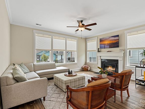 Start enjoying all of the Riverwalk neighborhood amenities in this lightly lived in 3-bedroom home. The main level has an open floor plan with a dining area and Great Room with a gas fireplace. A beautiful white kitchen includes a gas stove, stainless hood, and additional work space on the kitchen island. Located on the second floor, the primary bedroom has a large walk-in closet and an ensuite bathroom with two sinks and a shower with a seat. Two additional bedrooms, each with a walk-in closet, share a second full bathroom. The fenced backyard has a grassy area and an extended patio area with a covered porch. Riverwalk features paddleboard access to the Catawba River, a pool, walking trails and so much more!