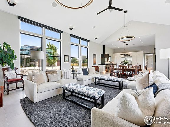 Discover a rare fusion of modern elegance, sustainable design, and serene luxury in this one-of-a-kind architect-designed ranch in Lafayette's exclusive Spring Creek Crossing enclave. This residence was custom designed and constructed by an architect as a personal home for himself and his family. This 2022 home offers exceptional comfort, functionality, and environmental consciousness, set on a pristine .77 acre glyphosate free lot with sweeping southern views of the Boulder Flatirons. Interior Highlights, 4,897 sq ft of refined living space , with 3,593 sq ft on the main floor and a 1,304 sq ft finished garden level basement, 5 bedrooms, 5 baths, including two spacious lower level suites and 10' ceilings and ensuite tiled bathrooms. Gracious covered entry opens to a formal foyer with coat closet and powder room, leading into the spectacular Great Room with soaring vaulted ceilings, floor to ceiling windows and a stone fireplace. Open concept kitchen and dining with oversized island, gorgeous natural stone countertops, premium fixtures, and abundant seating, designed for seamless entertaining, Light filled media room with Built in smart sound system with speakers in main living area and entertaining spaces for seamless high quality audio. Luxurious primary suite featuring a spa caliber bathroom with freestanding tub, dual vanities, custom dressing areas, and panoramic views of the Flatirons. Sustainable and Passive Solar Design, Oriented with intentional southern exposure , Deep roof overhangs and covered patios ensure cool, shaded comfort in summer months, enhancing energy efficiency. Constructed with Green Building Principles, using eco conscious materials , high performance windows, and efficent mechancial systems for sustainable living, full home technology with programmable motorized privacy blinds, remote sensor security and home automation.Outdoor living 1,230 sq ft of custom patio space, covered dining , lounge zone with ceiling fans, built in BBQ .
