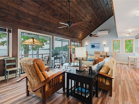 Welcome to your island escape on 1 private acre just off the channel side of Round Island, where privacy meets convenience and panoramic views stretch down the St. Lawrence River toward the Thousand Islands Bridge. Positioned perfectly for spectacular sunrises and sunsets, this property offers front-row views of ships gliding by from the comfort of your expansive waterfront deck. This well-maintained 3-bedroom, 2-bath seasonal cottage is designed for both relaxation and entertaining. The first-floor primary bedroom includes an en suite bath, while the soaring cathedral ceiling in the great room enhances the sense of space and light. The open layout connects to a custom Merillat kitchen, offering an ideal flow for gatherings. A built-in desk/workspace adds versatility, whether you're hosting guests or enjoying peaceful solitude. Built for longevity and ease of upkeep, the home features composite siding, Azek, and new composite decking on both the front and back porches for easy maintenance. A mini-split system offers heat and air conditioning during the shoulder seasons, and a whole-house UV/RO water purification system ensures clean, reliable water. Outdoor living is elevated with deep-water dockage, a covered boat dock with storage, and excellent swimming access in a protected setting. A detached storage shed with electricity provides flexible use—perfect for a home office, studio, or workshop. The cottage is being sold turnkey and fully furnished, including tools, power washer, lawnmower, and a full lineup of recreational equipment: a new 14' aluminum boat with 8 HP engine, 1 Kevlar canoe, 2 kayaks, paddle boards, rafts, and more—everything you need to start your river life right away. Located just a short boat ride to Clayton, this property offers the rare combination of island serenity and convenient mainland access. Whether you're seeking a summer getaway or a seasonal retreat, this Little Round Island gem delivers on views, quality, and the essence of island living