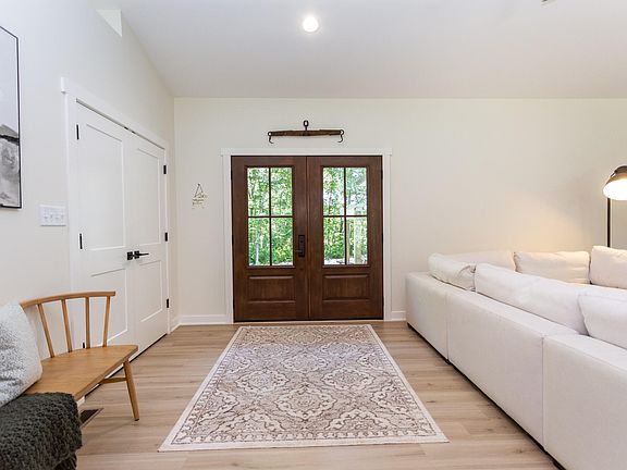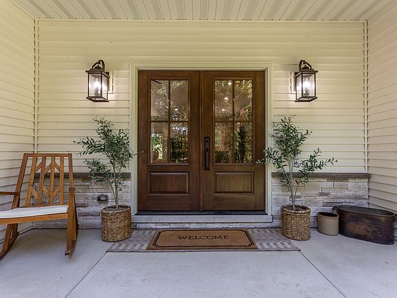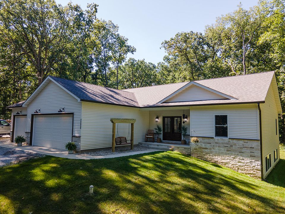 Welcome to this exquisite modern ranch home situated on a sweeping, wooded lot with a creek. This stunning home, completed in 2023, offers the perfect blend of contemporary design, luxurious amenities, and a spacious 3-acre lot. When you first step inside the double door entry, you are greeted by soaring vaulted ceilings, enhancing the sense of space and light throughout the main living area.The heart of this home is the chef's kitchen, thoughtfully designed, and anchored by the 10 foot island. Featuring custom cabinetry, double oven, built-in wine rack, pot filler, quartz counters, custom hood, and opens to the dining and living area.The main level is completed by a lavish primary suite, ensuite bath with dual sinks, and a walk-in shower. A daylight basement plumbed for a third full bath