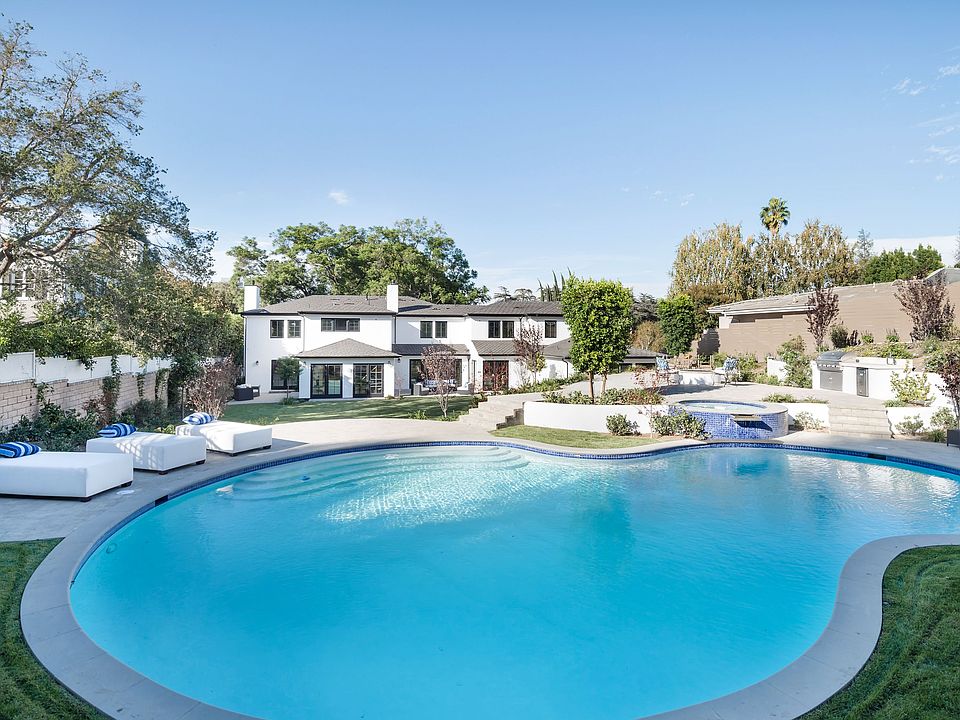 Located in the heart of Royal Oaks of Encino, sits a newly remodeled contemporary California craftsmanship 5BD/5.5 BA. This Cape Cod-inspired interior has rich French Oak floors throughout, generous living room with a fireplace, both formal dining and conversation rooms, a two-sided fireplace with an open kitchen, a cozy breakfast area, and all offer picturesque outdoor views. The kitchen itself is fit for a master chef equipped with a beautiful Calcutta marble center island with its own sink, six burner Wolfe oven stove, Sub Zero refrigerator, farmhouse sink and walk-in pantry. Upstairs, the four bedrooms come complete with a walk-in closet and marble bath, while the master suite offers dual walk-ins, double sinks, an oversized shower with a rain shower head and a free-standing tub overlooking the landscaping. The surrounding grounds with a lot size of 17,000 sq. ft. features a sparkling pool, spa, fire pit and large BBQ area, making it the perfect space to escape or to entertain.