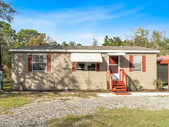Nestled on a sprawling 2.57-acre wooded sanctuary, this charming property offers a haven of tranquility. This 3-bedroom, 2-bath Nobility Manufacturer, Kingswood Model was built in 2020 and is 1000+ sq ft. The home stands as the centerpiece, surrounded by nature's beauty, zoned AR. Kitchen boasting wood cabinets, a welcoming breakfast bar for casual seating, and a convenient indoor laundry area. The master suite featuring a generous walk-in closet and a walk-in shower. Crown molding and cathedral ceilings grace the living room and dinette area, creating an atmosphere of openness. A thoughtfully designed carport and a versatile metal garage/workshop await. The garage/workshop is equipped with water and electric connections, complemented by a remote roll door for ease of use. Convenience meets nature with proximity to shopping, the serene Crews Lake Wilderness Park, and easy access to the Suncoast Parkway. This property isn't just a home; it's an invitation to embrace a lifestyle where comfort and natural beauty converge seamlessly. Furnished for sellers convenience.