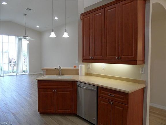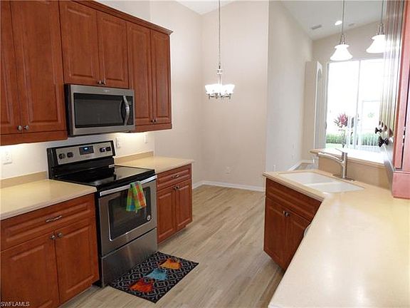 Welcome HOME to this beautiful, resort style, well established, gated community of Laguna Lakes! Priced for under 300,000, you will love this "like new" 3 bedroom, 2 bath, 2 car garage in the Santa Barbara section of Laguna Lakes. Home was built in 2004 with a tile roof, and includes high ceilings and vaults throughout. Open kitchen family room overlooks the lake. Separate formal living/dining area at the front/entry of the home. (Floor plan attached). Fresh interior paint, (including garage floor), NEW stainless appliances. NEW "wood look" PORCELAIN floor tile in kitchen/entry/living/family and guest bath rooms. NEW carpet in all 3 bedrooms. Convenient location near Fort Myers and Sanibel beaches, shopping, dining, Healthpark hospital and all kinds of entertainment. Low association fee (about 225 per month) includes SO many amenities such as sidewalks on both sides of the street, basic cable, lawn care, along with the clubhouse and resort style pool, spa, work out facility, billiards, volleyball, playground, and more! HVAC replaced in 2011, and exterior repainted in 2012. Hurricane shutters included.
