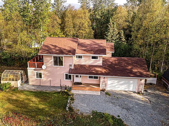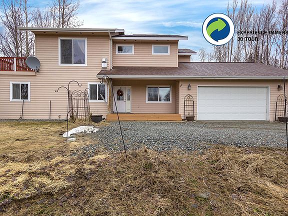 View the 3d tour Easy to modify into a good Air BNB Two story south facing home on Lazy Mountain, just 15 minutes from downtown Palmer. Large windows provide wonderful heat gain on sunny days year round. Main living area with vaulted ceiling and master suite with coffered ceiling are located upstairs. Large master bath has jetted tub and open shower area. Downstairs can be made into one or two