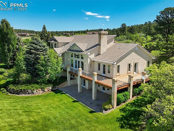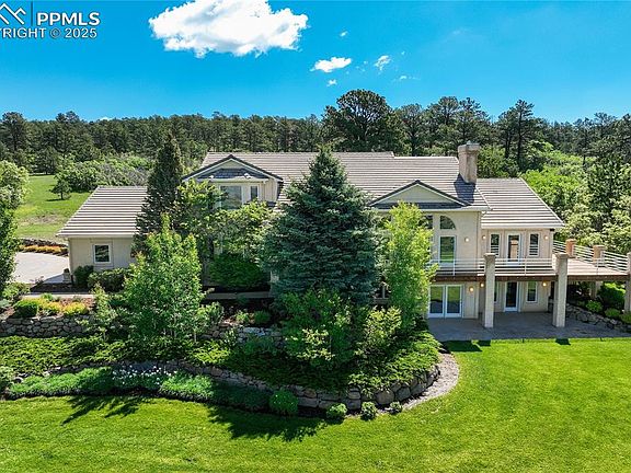 Private 5acres in the desirable Kingswood community, this executive estate delivers unobstructed Pikes Peak views, equestrian zoning, & a layout built for both everyday comfort & entertaining—just minutes from I-25 & modern amenities. A long private drive leads to a circular turnaround centered by a mature pine connects the house & heated 48x36 barn. The main lvl opens to a large vaulted great rm w/a wall of windows, flooding the space w/natural light & views of the mtns. A dble-sided FP connects to a dedicated office w/built-ins, deck access, & private entry to the primary suite. The gourmet kitchen includes a new gas cooktop, oven, microwave/convection, dishwasher, basin sink, island w/breakfast bar, updated pendant lighting & built-in workstation, walk-out access to rear concrete patio tucked into the scrub oak. The solid hardwd flrs flow throughout the hallways & formal dining area, complete w/bay window, tray ceiling, updated lighting. The main-lvl primary suite has walk-out access, surround sound, walk-in closet & 5-piece bath w/ updated tile floor. Upstairs are 3bedrooms w/generous closets & one of the rooms has private access to the full bath & they all have window seats, one w/panoramic mtn views. The finished walk-out bsmnt adds multigenerational flexibility w/a full 2nd kitchen w/dining area, secondary laundry hookups, & a large family rm w/FPthat opens to the covered stamped concrete patio. A custom indoor spa rm. Storage is extensive, including a dedicated room w/custom sliding shelves on metal rails. Interior updates include all new carpet, fresh paint, updated lighting, new insulated garage doors, central sound system, central vacuum, skylights, two 50-gallon water heaters, instant hot water heater, diesel generator w/storage tank, & air compressor all included. The heated barn accommodates animals & equipment w/three dirt floor stalls & concrete floor, hayloft, 200-amp service, a piped corral, & a sprinkler-fed acre of irrigated grounds.