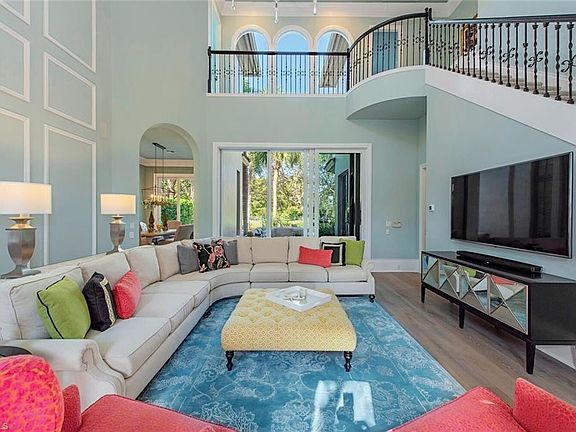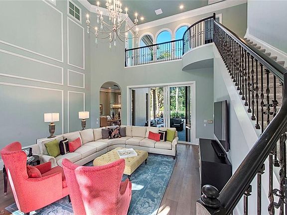 H.649 - Exquisite Mediterra residence with stunning modern renovations throughout! The private courtyard entrance leads to the grand living room with soaring 28-foot ceilings & views of the pool, spa & tranquil lake, and lush landscaping beyond. Modern renovations such as wide plank wood flooring and redesigned master bath are complemented by soothing tones and fully furnished designer decor. The kitchen will delight the family chef with its high-end Dacor & SubZero appliances. The master suite on the 1st level is a special retreat with a completely remodeled bathroom including stand-alone tub, & large walk-in shower with frameless door. Upstairs are two private guest suites. A new HVAC system has been installed & includes duct work, professional-grade dehumidifier & enhanced air filtration with UV lighting. The pool/spa recently converted to a saline system with all new equipment. The home also features a new whole house HEOS sound system for music & television. Home offered fully furnished. Mediterra offers a luxurious Naples lifestyle with 2 championship golf courses, an exclusive beach club & more!