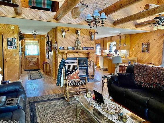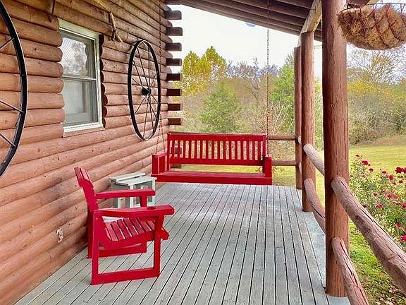 Rustic log cabin on secluded 31.85 acres! 3 bedroom 3 full bath with walk out basement. Step out of the living room to a fully covered deck and enjoy the views of the pond and deer that come to visit! 24x35 garage as well as a carport for additional parking. Creek and stocked pond will keep you fishing in your own back yard. Plenty of space with 3 levels! Real hardwood floors and walls are finished pine wood. Open loft on 3rd floor. DO NOT ENTER PROPERTY WITHOUT AN AGENT PRESENT!!