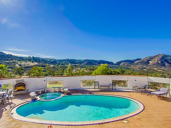 INCREDIBLE BREATHTAKING VIEWS from this beautiful custom Spanish Style Hacienda/Retreat with Blue Dome. Enter through the private gates onto over 8+ acres - with room to roam! Lots of amenities which includes pool, spa, Cabana, tennis court, stables, horse corrals and more. The front courtyard features include a fountain with views of downtown San Diego. Wonderful breezes throughout the year from your mountaintop retreat! Potential for a vineyard or ?? Room to grown and plenty of room for your toys, RV, children and more! Bring your ideas and paint this wonderful estate into your forever dream home. Equipment: Pool/Spa/Equipment, Range/Oven, Shed(s) Sewer: Septic Installed Topography: RSLP,GSL