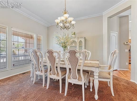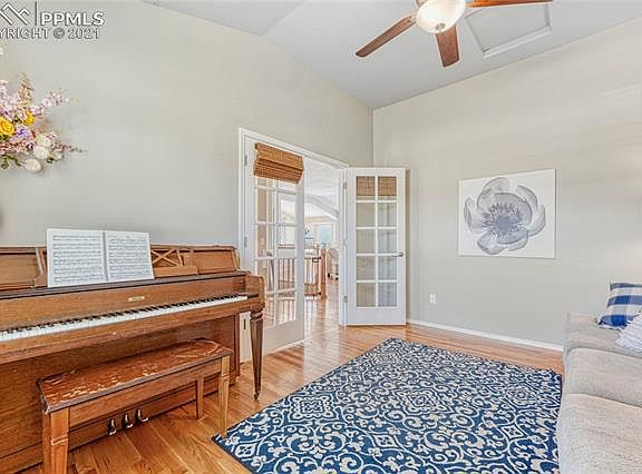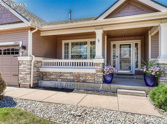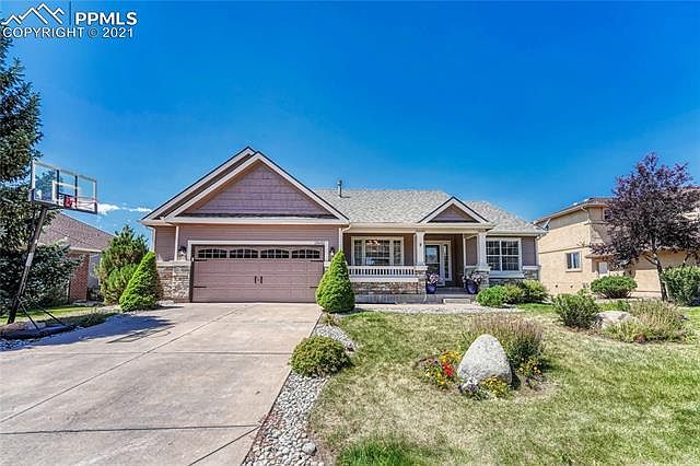 Move-in ready and waiting for your family is this spectacular ranch style home in Jackson Creek with outstanding Pikes Peak and the USAFA views that are second to none. Hardwood floors welcome you and features French doors that lead into the office and the formal dining room has crown molding and cut outs that open for views of the great room for a very bright and open floor plan. The vaulted great room boasts a stacked stone gas fireplace and a wall of windows and is open to the vaulted breakfast nook with a bay window and a walk-out to the covered deck that encompass the whole backside of the home with the most beautiful views of the Front Range and the USAFA. Hardwood floors, granite countertops, travertine subway tile backsplash, all appliances, a pantry and a coffee bar complete the kitchen. The laundry room with built-in cabinets is off the oversized two-car garage. The vaulted master bedroom offers an attached 5 piece bath with soaking tub and a walk-in closet. The lower level features an expansive family room and game room great for entertaining plus a walk-out to the covered patio and the wonderful parklike backyard with trampoline and a playset for the little ones. Three additional bedrooms all with good size closets and a full size bath make up the rest of the lower level. Great location, near shopping, dining, parks and school.
