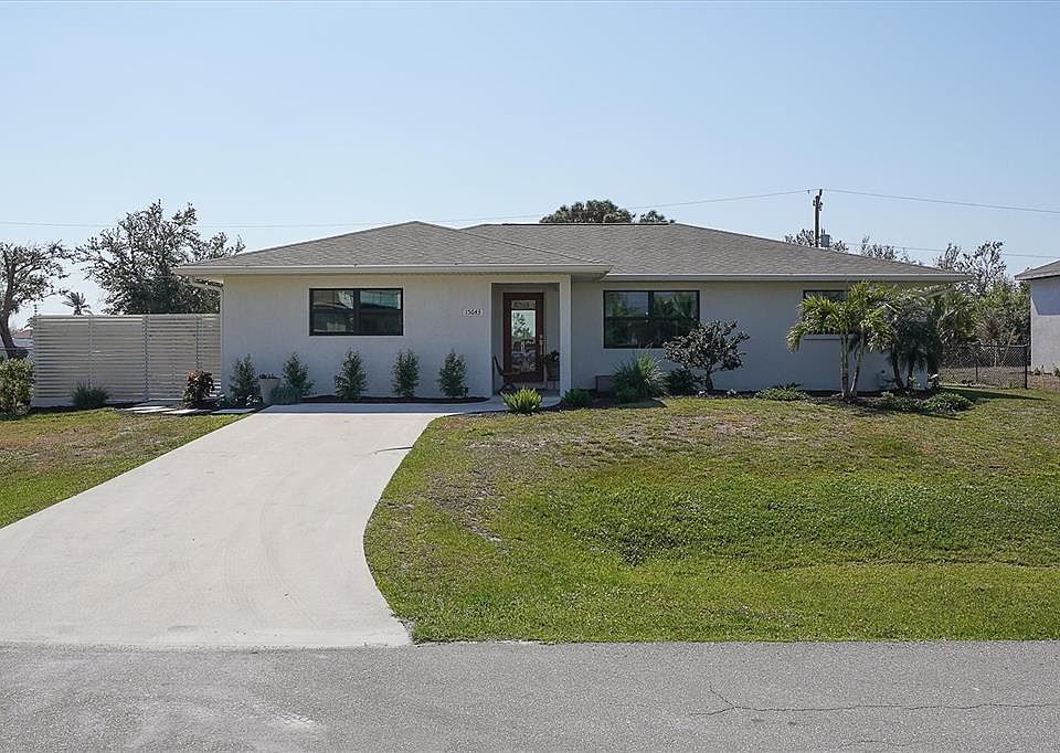 You won't want to miss this adorable home, located in the highly sought after neighborhood of South Gulf Cove. Close to Boca Grande and Englewood Beaches. It would make a perfect Airbnb, permanent residence, or wintertime second home. Not only is the interior of this house ready to move right in, but the exterior has all new landscaping and sits on a DOUBLE lot, nearly Half an Acre. And both lots are entirely fenced in. The Possibilities are endless, add a 3 car garage, a pool or even an addition. The home is completely Remodeled, top to bottom, from the New Roof in Dec. 2022, to the new luxury vinyl plank throughout the entire home, to all new drywall, trim, windows and doors. All new bathrooms featuring custom tile showers, new vanities and flooring. The kitchen has all new stainless steel GE appliances, new cabinets and custom poured concrete countertops. The new windows are large and let in an abundance of Florida Sunshine, and the open floor plan is perfect for entertaining all your visitors from up north or your new Florida friends. An added bonus is you won't have to worry about a new build out your back door, the neighboring lots are owned by fulltime neighbors so little chance of a developer purchasing for new construction.