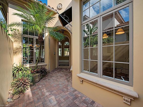 An intricate paver courtyard leads to an arched entryway and stunning wooden front door, instantly setting the tone for relaxed luxury and comfort. This exceptional villa boasts an expanded split floor plan surrounding the courtyard allowing abundant natural light to flood the home, all highlighted by tropical lake views. This home is appointed with volume ceilings, wide crown moldings, large baseboards, arched passageways, extensive windows with plantation shutters, lush carpet and gorgeous tile throughout. The gourmet eat-in kitchen offers a spacious breakfast bar, stainless steel appliances, gas cooktop and pantry. The expansive screened courtyard is bordered on three sides by the master suite, formal living room and family room, allowing for seamless indoor and outdoor living. Relax in the tranquil master suite with a spacious walk in closet and large master bath, with direct access to the screened courtyard with bubbling spa. Guests will feel right at home in the two comfortable guest suites. An open-air lanai surrounds the newly refinished pool with lake views beyond.