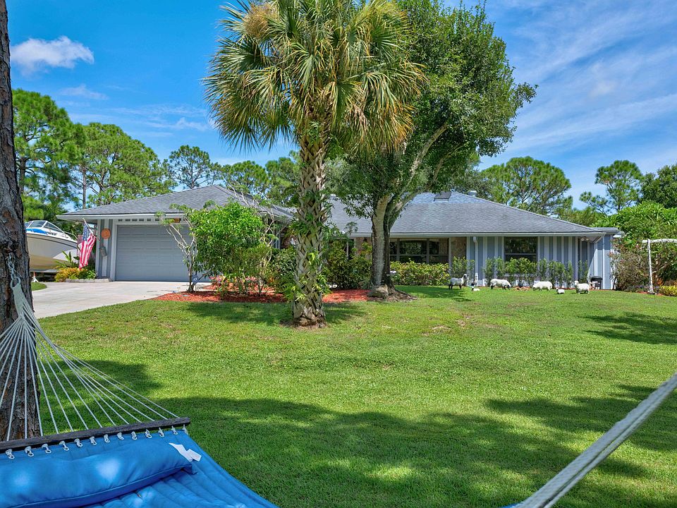 Home with good Karma! Warm, eclectic 3 bedroom, 2 bath split floorplan. Beautifully updated master bath w/double glass sinks, large shower and spa tub. His/her walk in closets. Master bedroom also features access to covered, screened porch plus separate 15x10 wood deck overlooking the peaceful stocked pond! Guest bedrooms both enjoy bay features on north wall. Kitchen has abundant cabinets, pantry w pull out drawers & granite counters w/breakfast bar plus 11x10 eat in area with bay window. Huge 20x19 wood deck off kitchen for outdoor entertaining! Family room/office/den offers backyard view and French doors into living room with gleaming real hardwood floors! High & dry lot! Storage shed. Home also enjoys city water! Bring your toys to country living only 3.5 miles to I-95!