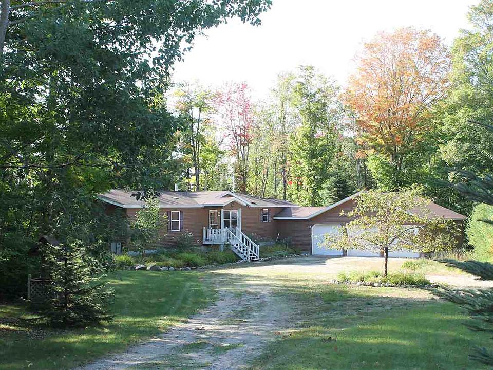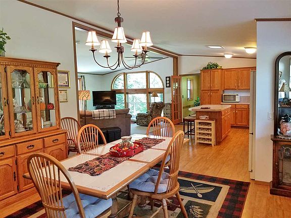 Over 1800 sf of space in this immaculate 3 bedroom/2 bath custom Wick home. There is a covered porch/front entry, cathedral ceilings, and drywall throughout. Kitchen has island, counters with ceramic tile edges and backsplash, and commercial-grade vinyl flooring. (Includes appliances.) Living room features LP gas heatilator fireplace, a full wall of windows, and slider to wood deck/gazebo/patio area. Master bedroom suite w/soaker tub and walk-in closet. Main floor laundry includes washer, dryer, and utility sink. Windows conveniently fold out for easy cleaning. There are solar tube lights in kitchen and baths. Beechwood blinds throughout, along with Hunter light fixtures and fans. Three-car attached garage (w/attic storage space) is separated from house by mudroom and bonus room/office. There are four wooded acres, a circle drive and established landscaping consisting of numerous lilacs and perennials. Artesian well. The home features heavy duty vinyl siding along with windproof installation/locked-in corners and VentilAire whole house ventilation system. Roof shingles have a 30-year warranty and trusses can withstand a 9' snow load. Poured concrete basement (reinforced with re-bar) has high ceilings and egress window - ready to become finished living space. Near snowmobile trails and only a short distance from town and three inland lakes!