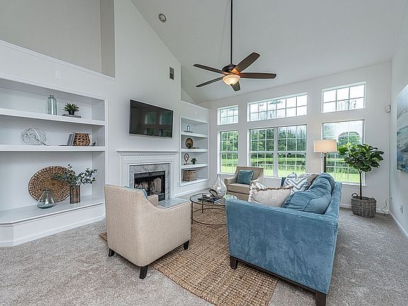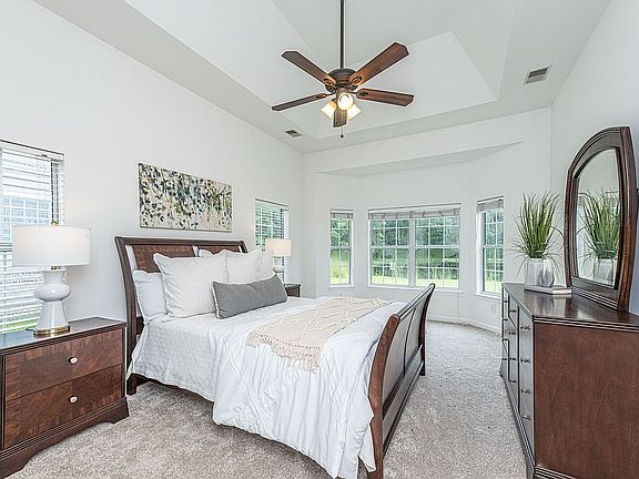 Located just a short walking distance to the Bees Landing Recreation Center ball fields and tennis courts, this 4/5 BR home features a downstairs owners suite, 3 guest BR's up, a large FROG that could be 5th BR, a home office, a dining room, and a 2-car garage! Kitchen with center island and eat-in breakfast area opens to the 2-story family room with fireplace. Freshly painted soft white walls throughout with new carpet. This two story home with double porches has no homes behind or in front! Enjoy watching wildlife from your screened porch on the pond in the backyard. Sidewalks on both sides of the street and a community pool! Groceries, dining, & schools all nearby.