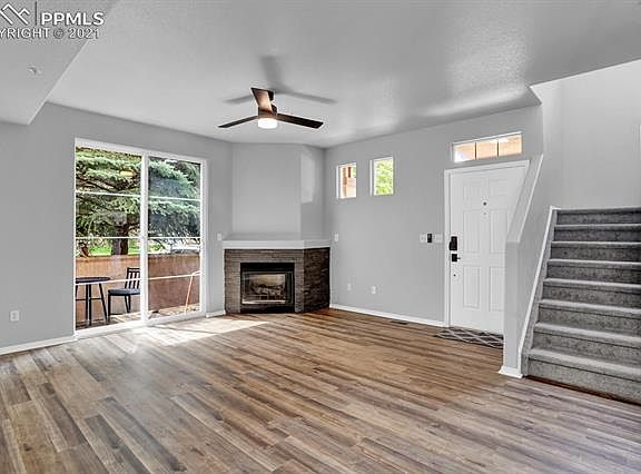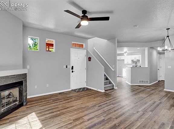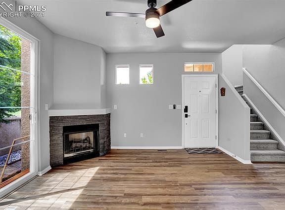 Beautifully upgraded end unit condo with 2 bedrooms and 3 bathrooms in a park like setting! Complete renovation like no other! You will enjoy maintenance free living at The Courtyards at Quail Lake, just minutes away from all the best that Colorado has to offer. Enter into the main floor with tons of natural light, laminate wood floors, new light fixtures and new paint. The kitchen features a gorgeous focal tile wall with floating shelves, new tile backsplash, quartz counter tops, a pantry, refinished cabinets with new hardware and a new stove, dishwasher and sink. The living room has a cozy gas fireplace with brick surround and a walk-out to the patio with a privacy wall. Rounding out the main level is a convenient powder room and laundry room with washer and dryer included and extra storage space. Heading upstairs, you will notice the new carpets and open feel with the spacious loft area and large windows. The master bedroom boasts high ceilings with a ceiling fan, a large walk-in closet as well as an attached 4-piece bathroom. In the master bathroom, there is an upgraded double sink vanity, tile floors and a tub/shower combo with new tile surround and frameless glass doors. Also upstairs, is a 2nd bedroom with high ceilings and a full bathroom with tile floors, a walk-in shower with tile surround and black framed glass doors. Other great amenities of this amazing condo include an attached 2-car garage, a crawl space and central a/c. Prime location close to I-25, World Arena, Fort Carson, Colorado College, the Boardmoor, shopping, restaurants, entertainment, Quail lake for fishing, walking, hiking trails, and paddle boarding. Dont look any further, this is the perfect home!