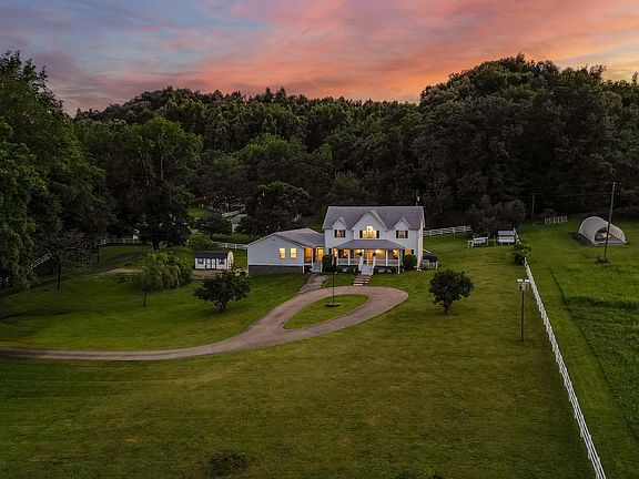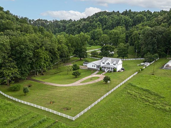 Picturesque Equestrian Farm, spanning 80 acres of lush, rolling pastures & beautiful landscapes. This custom home has been renovated & has main house+apartment+in-law quarters. Main level has office w/built-ins, great room w/fireplace, formal dining. Horse barn w/insulated tack rm, 1/2 bath, washer & dryer, 6 horse stalls w/hay storage+room to add more. The cow barn has chute that opens to one of the paddocks & can house your new tractor+implements that will remain! The screened-in front porch invites you to relax on the porch swing. Upstairs, new carpet & paint in the 3 bdrms + 2 baths & a built-in library wall. Downstairs, a large great room w/fireplace, formal dining room that leads out to screened-in porch. Kitchen has soapstone counters, farmhouse sink & appliances remain.