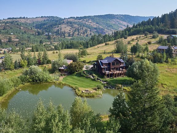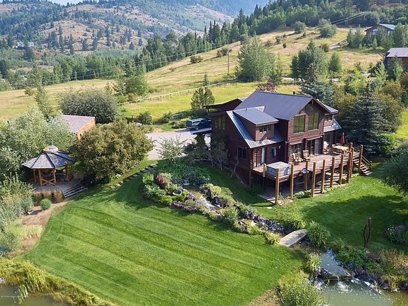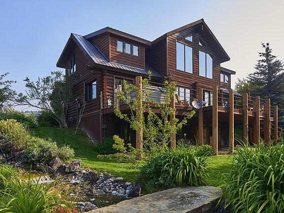 This custom home is full of character and charm, boasting 4 bedrooms, 3 full baths and high-quality finishes throughout. Perfectly positioned in a highly sought after location with abundant light, mountain views and a host of outdoor living areas. Wood floors compliment the Swedish Cope logs, and the floor to ceiling south-facing windows bring the outdoors in. A classic wood fireplace accents the main living area which spills onto the expansive rear deck overlooking the landscaped and native grounds. The kitchen features stainless appliances and undercounter lighting which highlight the granite countertops. Each floor provides a bedroom and full bath, plus one additional bedroom on the lower level. A floating staircase leads to a spacious loft which could be used as an office. The detached garage is roughly 2,000 sf including 4 bays plus an additional carport all of which are accessed via a paved driveway spacious enough for a full size pickleball court. Rounding out the offering, there is a chicken coop, greenhouse, garden beds, fenced pasture area and a gazebo overlooking the 1/3-acre pond complete with a recirculating, cascading creek.