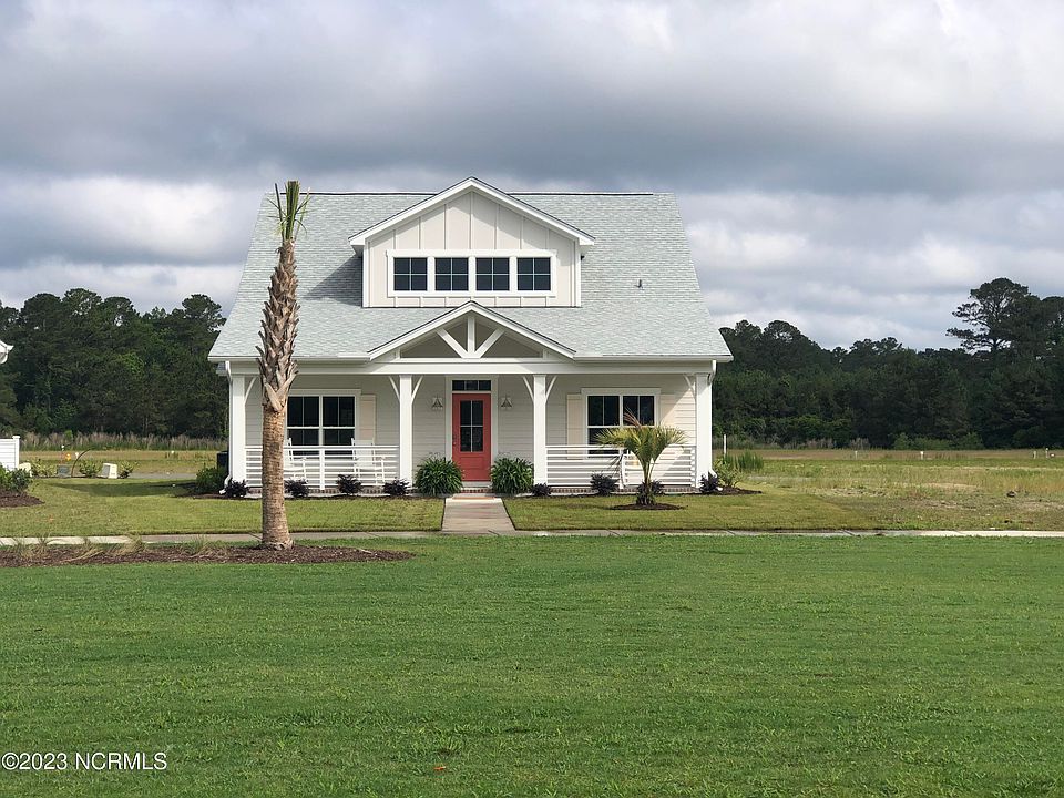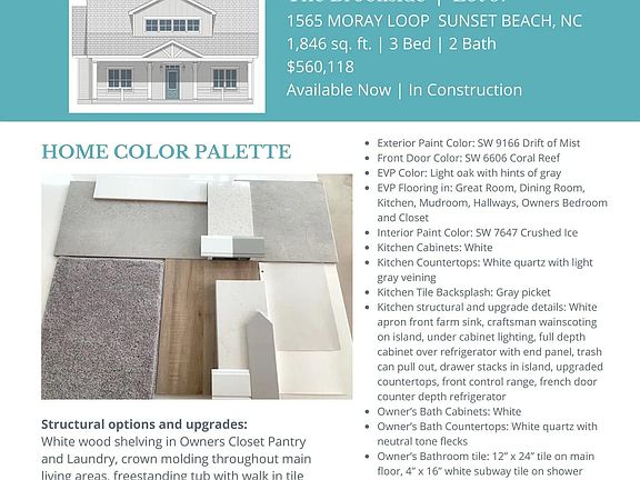 The Brookside home plan by Bill Clark Homes overlooking one of the many ponds in the Sanctuary at Sunset Beach is MUST SEE! At 1846 sf this house is one level living at its finest. Boasting a large owners suite and a split floor plan both owners and guests have plenty of privacy. The open kitchen, dining, and living areas draw in the natural light and create an inviting area for relaxation and entertaining. The Sanctuary at Sunset Beach offers resort style amenities including a clubhouse, fitness center, pool, fireplace pavilion, and grilling stations (scheduled to start construction late 2022). Home Exterior: SW 9166 Drift of Mist. EVP Flooring: Light oak with hints of gray. EVP Flooring in Great Room, Dining Room, Kitchen, Mudroom, Hallways, Owners Bedroom and Closet. Interior Wall Color: SW 7647 Crushed Ice. Kitchen Cabinet Color: White.  Kitchen Countertops: White quartz with light gray veining. White wood shelving in Owners Closet Pantry and Laundry, crown molding throughout main living areas, freestanding tub with walk in tile shower in Owners Bath, additional windows in Great Room with built ins and stained beams, built in bench with hooks in Mudroom, craftsman trim package, floor outlet and additional recessed lighting in Great Room