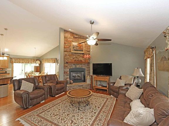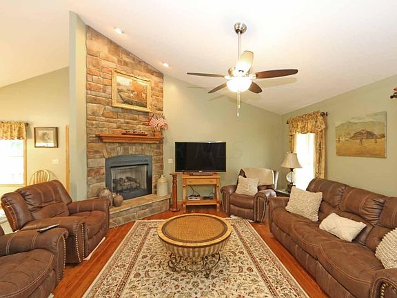 Beautiful Schlabach constructed ranch home, pretty country setting, .866 of an acre, 3 bedrooms and 2 full baths, great room floor plan with vaulted ceilings and hardwood floors, floor to ceiling fireplace with gas logs, adjoining dining area and gorgeous cabinet filled kitchen with pantry, island and stainless steel appliances, convenient main level laundry, owners bedroom suite with private bath and double closets, full basement with large windows and could be finished for additional living space, amazing outdoor patio space that is perfect for entertaining, attached 2 car garage plus a detached 32 x 24 pole barn, truly impressive home that won't last long at $350,000.