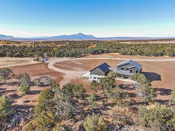 Welcome to your modern Colorado sanctuary, where nature and convenience blend seamlessly on 35 acres adorned with Juniper trees and breathtaking views of the Ute Mountain with year round elk and deer that freely roam around the property. This home is a true masterpiece, inside and out, with its modern design and sleek black-framed Anderson windows that capture the mountain surroundings. Step inside, and you'll be greeted by a grand foyer leading to a large vaulted living area, complete with a stunning stone masonry gas fireplace. The kitchen is chef's dream, equipped with all stainless steel appliances including a high-end Muller oven, and abundant soft close knotty alder cabinetry. Beautiful granite countertop island adjacent to dining area that caters to all your family and friend gatherings. The master bedroom is calm and relaxing with a lovely view through the french doors leading to the back yard. The master bathroom features a spacious tiled walk-in shower, a standalone soaking tub, and a double vanity. The walk-in master closet is complete with ample custom shelving throughout, to add a touch of organization to your life. The guest bathroom near the main living area features floor-to-ceiling tiled shower walls. Separate mudroom as you enter through the garage. The laundry room is spacious with an abundance of cabinetry and counter space and utility sink that simplifies daily tasks. An alluring office with amazing views for those that need a happy and quiet space of their own. Upstairs, you'll discover an upper living area with an impressive view of the space below, and natural light creating a relaxing lofty atmosphere. Two generous sized guest bedrooms, each with spacious closets that share a beautifully appointed bathroom with a large tiled shower. The 43'x28' garage is impressive with 16'x10' and 9'x10' garage doors to easily accommodate your vehicles and storage needs. RV hookups on the property as well. Location is ideal to embrace summer with river floats, live music, and water activities at the nearby McPhee and Narriguinip Reservoir, or embark on mountain adventures with quick access to well known biking trails like Boggy Draw and Phil's World. And when winter calls, world-class skiing at Purgatory, Hesperus, and Telluride is all about an hour and a half away. Don't miss this golden opportunity to own a home that perfectly balances modern luxury with the natural beauty of Colorado. Seize the chance to embrace the Colorado lifestyle you've always envisioned and make this your new home today!