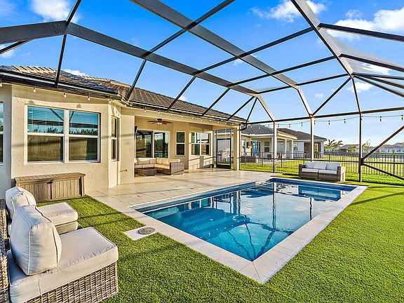 Welcome to your DREAM HOME! This STUNNING 3 bedroom, 2 bathroom home is situated on a spacious CORNER LOT in the esteemed and GATED community of the Meadows at Westlake, tucked away in the western most part of West Palm Beach. Your beautiful new home boasts almost 2,000 square feet of living space, CBS construction, IMPACT glass throughout, and the most PICTURESQUE backyard with a NEW SPARKLING heated pool surrounded by turf and travertine pavers, that is fully screened in with a large covered patio area PERFECT for entertaining or for enjoying your SERENE LAKE VIEW! As you pull up to your impeccably well kept home with beautifully maintained landscaping, you will notice your EXTENDED driveway and 2-car garage. Inside, you are greeted by an ample amount of NATURAL LIGHT coming in from all angles and beautiful wood like flooring throughout. With an open and split floor plan, to your right, you will find two SPACIOUS bedrooms and one full bathroom providing a private retreat for family or guests. To your left, you have an OPEN living space perfect for hosting gatherings or spending quality time with loved ones. It is extremely VERSATILE and can be used as a den, home office, playroom, or your formal dining area - the options are endless!