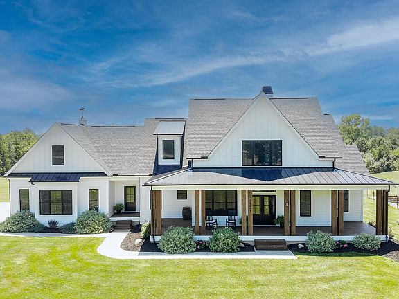 Welcome to this beautifully crafted custom home, completed in 2020, offering timeless modern farmhouse design with thoughtful finishes throughout. The striking exterior features a double-gable front elevation, partial wrap-around porch, and French door entry, setting the tone for the elegance within.