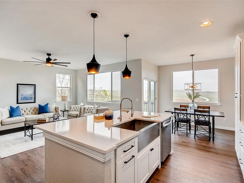 Rare ranch home backing up to open space. This four bedroom home was recently renovated from top to bottom. Every surface throughout the home has been replaced and upgraded. Immediately stepping into this home you are greeted with views of the rocky mountains from Pikes Peak to Downtown. The entry features an oversized chandelier. The kitchen and living room are open to one another and include designer finishes. All new soft close cabinets, quartz countertops, marble backsplash and stainless steel appliances have been added. The kitchen and living room enjoy the best views in the house. The master suite is located on the main level. With vaulted ceilings, stand alone bathtub, large vanity and oversized standup shower this home competes with the best homes in Parker. With a large rec room and media area as well as a wet bar and island this basement is great for entertaining. There are also two large bedrooms with walk in closets, and a full bathroom in the basement.