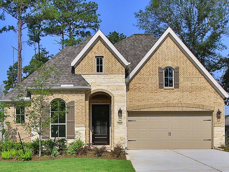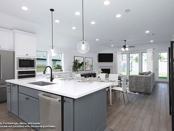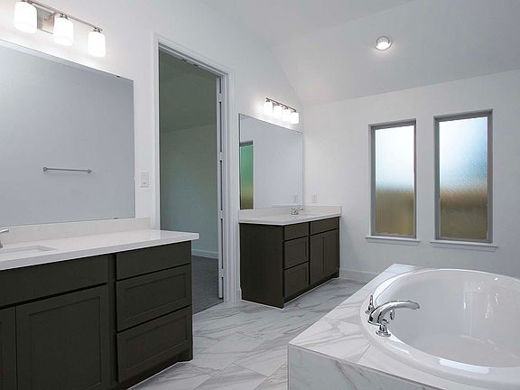 Extended entry with 13-foot ceiling leads to open kitchen, dining area and family room. Kitchen offers generous counter space, corner walk-in pantry and island with built-in seating space. Dining area flows into family room with a wood mantel fireplace and wall of windows. Game room with French doors. Primary suite includes double-door entry to primary bath with dual vanities, garden tub, separate glass-enclosed shower and two walk-in closets. Secondary bedrooms feature walk-in closets. Extended covered backyard patio and 11-zone sprinkler system. Mud room off three-car garage. Representative Images. Features and specifications may vary by community.