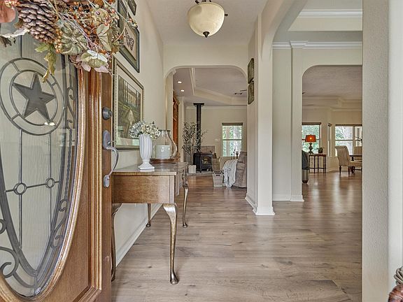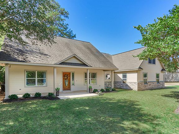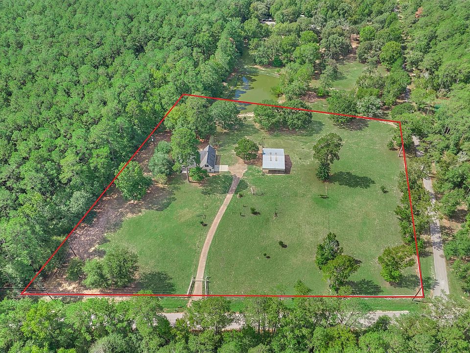 Beautiful country home on 5 acres, zoned to MISD! Surrounded by the Sam Houston National Forest and near Lake Conroe! New flooring and fresh paint throughout, high ceilings, and open floor plan with ample windows for plenty of natural light! Wood burning stove in the living room, adding to the country home charm. 3 Bedrooms downstairs, with ensuite bathroom for the Master and 2nd bathroom with large walk-in shower. Stairs to the 4th bedroom/game room complete with new oak treads. Property perimeter has wood fence with wire mesh as well as cross fencing and 28x35 utility bldg. on slab, three stables, tack room/large workshop with power designed for RV storage, and well house (perfect for tool storage). Fruits trees in the pasture consist of Dwarf Pomegranate, Trifoliate Orange, Sawtooth Blackberry Bush, Mustang Grapevine, & 2 Muscadine Grapevines! Relax and watch the sun set over the pond through the back windows or from the comfort of the covered back patio.