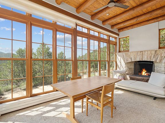 Historic Eastside 2-bedroom, 2-bath residence at the end of a charming lane off of coveted Cerro Gordo Rd, offers a perfect blend of iconic Santa Fe style and modern comfort. With unobstructed views of the majestic Atalaya Mountain, this home invites you to embrace the beauty of nature right from your doorstep. Traditional plastered walls and vigas. The living room, featuring a fireplace, opens to to a large sunroom with fireplace, which serves as a second living area and dining space. Floor-to-ceiling windows frame forested mountain views, bringing the outdoors in and filling the home with natural light. The updated kitchen is equipped with a high-end Wolf range and butcher block countertops. An informal dining area is a delightful spot for casual meals. Primary suite with a luxurious en-suite bath and a walk-in closet featuring custom built-ins. The second bedroom offers versatile space, ideal for guests, a home office, or a creative studio. Flagstone patio, where gorgeous views create a magical setting for al fresco dining or outdoor gatherings. Located just moments away from Canyon Rd and the historic Santa Fe Plaza, this home is perfectly positioned to enjoy the rich culture, art, and dining that Santa Fe has to offer.