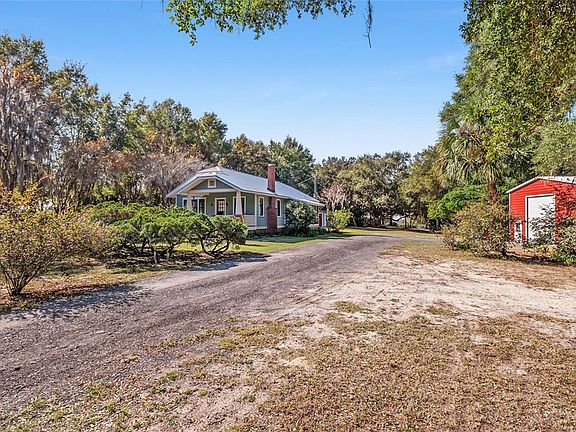 Beautifully restored 3/2 historical home on 6.38 Acres made up of 2 parcels that could have up to 2 homes on each if divided. This country setting has beautiful shade trees, landscaped, 3 board fenced frontage, no flood zone but close to Lake Weir, The Villages, 45 minutes to WEC-World Equestrian Center and with A1 zoning if you want to set it up for horses. This home has heart pine wood floors with really nice color tones, natural finished wood trim & doors. The ceilings are high throughout and coffered with heart pine in the dining & living room which also has a wood burning fireplace. Two of the three bedrooms access a Jack and Jill bathroom with a claw foot tub, custom tile floor, beaded wood walls, built in storage closet and newer fixtures. Second bathroom built in 2022 with all the historical look plus a new shower, fixtures and stackable washer/dryer. Kitchen has a built-in baker's hutch, a 4' x 7' walk in pantry closet, butcher block counters, stainless front drawers and an antique sink top. This home has many original features like picture hanger trim, wood panel and French doors, shoe mold & base cap trim on tall baseboards, beaded wood, antique lights and hardware. Updates from 2021-2022 include: New metal roof, AC, high efficiency water heater, insulation, updated plumbing & electric. Enjoy the beauty outside with an 8' x 16' covered front porch and a separate screened porch on your way out to the tiki hut with covered area to sit and sip. There is a 24' x 35' steel building with 16' wall height built in 2022 with electric panel, outlets, LED lighting, a 13' high roll up door and a service door. There is also an open front 20' x 20' metal shop, and an enclosed 11' 6" x 16' metal shed. This location is so close to all the shopping, dining and entertainment of The Villages or enjoy some time on Lake Weir at two waterfront restaurants or out on a boat. Plenty of nearby golfing also. Don't miss the video tour link. Owner financing possible starting from 20% down.