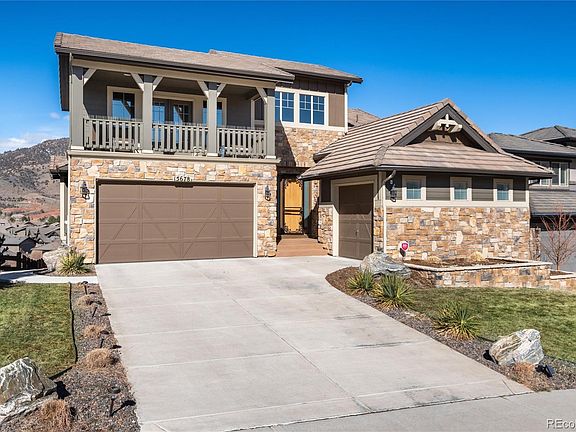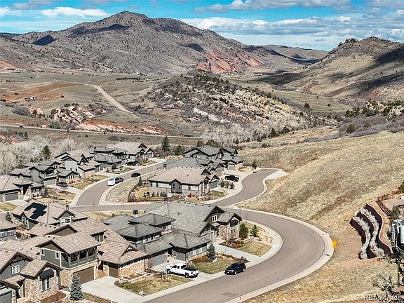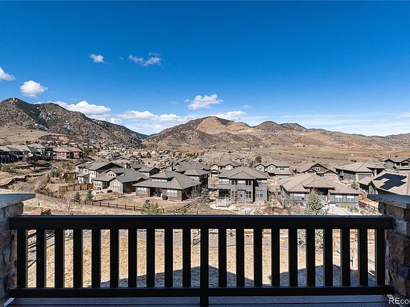 Sweeping mountain views nestled in the foothills of the desirable community of Lyon’s Ridge! Open floor plan with gourmet kitchen, upgraded appliances and 2-story stone fireplace. Beautiful hardwood floors! Abundant windows throughout to enjoy the incredible views. Spacious Main floor owners suite with mountain views and access to the covered deck. Second bedroom or study on the main level with adjacent full bathroom. Dining room with butlers pantry - perfect for entertaining. Upper level bonus room with double doors leading to the deck overlooking open space - perfect as an office, studio or game room. The walk-out lower level has a spacious great room with gas fireplace. 3rd bedroom with attached 3/4 bathroom and 4th bedroom being used as an exercise room with adjacent bathroom. Walk-out to the fenced backyard and enjoy the views. Acres of private open space and trails! Ride your golf cart or walk to Red Rocks Country Club with a 18 hole private golf course, restaurant and pool.