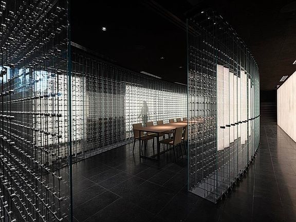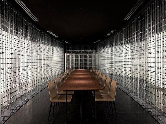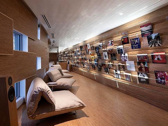 Refined interiorsCurved wood wallsTop-of-the-line miele appliancesSophisticated stone countertops