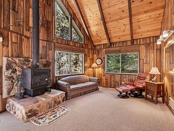 Sweetness of Life: Your Perfect Cabin Getaway If you're searching for a charming cabin to call your own, look no further! This delightful open loft chalet features one of the most popular floor plans. Located on a wooded lot, the cabin boasts two bedrooms, two baths, and a spacious loft. You'll love the large laundry room and ample storage, both inside and underneath the house. The living area has soaring ceilings and a cozy wood stove, perfect for those chilly nights. Step outside to enjoy a multi-level composite deck, ideal for bird watching and star gazing. With plenty of parking at street level and a driveway that extends to the lower lot, convenience and charm await you at this woodland retreat.