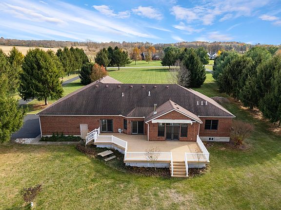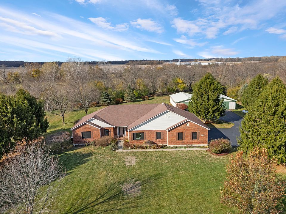 Car lover, hobby space... You will love this property with two matching outbuildings measuring 30×50 each. The home has a 3-car attached garage with a total of 17 places for cars! Sharp brick steps and front porch entrance with ceramic floor entrance, All BRICK ranch home in rural Clark County on 2.570 acre of land. Blissful views of farm fields and sunsets. Home features a great room with cathedral ceilings and double ceiling fans, eat in kitchen, sliding doors with walk out dining room onto the massive composite deck. Attic fan, poured walls and central vacuum system The lower level ceiling is 10 feet and there is an off season walk in closet, plumbing ready for lower level bathroom. 200 amp electric service. THE BLISSFULNESS OF COUNTRY LIVING!