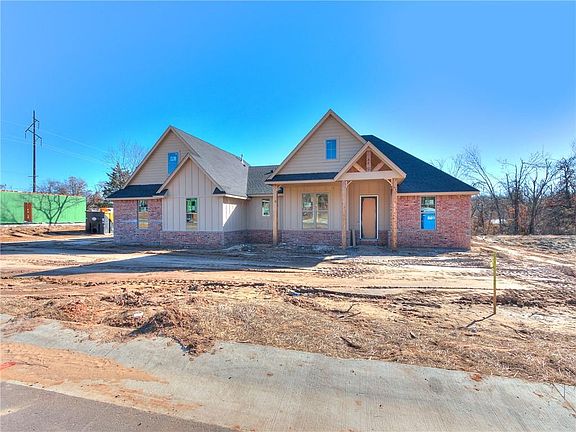 New home being built in Rustic Oaks addition -- a one-entry, gated neighborhood in Choctaw! This 3 bedroom, 3 bathroom + bonus room farmhouse features hardwood flooring throughout the main living areas! You'll fall in love at first sight when you see the large front porch, warm brick exterior, and cedar accents. Open layout with formal dining, living area with vaulted ceiling, large kitchen and breakfast nook. Beautiful cabinetry featuring floating shelves, "X" pattern cabinets, exposed wood beams and more! Large master bedroom with ensuite bathroom that includes soaking tub. Bonus room includes full bathroom for easy access. Security system. Fully sodded 1/2 acre lot with landscaping. Schedule your private showing today!