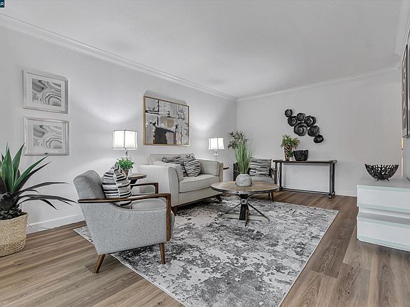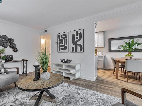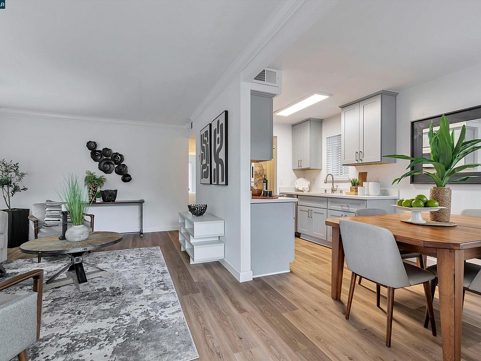 Upper level end unit. No neighbors above. You will be captivated by the inviting living room and spacious dining area with lots of natural sunlight. The entire unit was extensively updated last year! The renovated kitchen offers shaker style cabinets, stainless steel appliances, simple and elegant quartz solid surface countertops. Full size, interior, side by side washer/dryer in closet for convenience. Tasteful and contemporary luxury vinyl plank (LVP) flooring installed entirely creating a seamless and expansive look. Recessed lighting and dual pane windows throughout. The open floor plan allows for a smooth transition from the living room to dining & kitchen area with slider door access to private patio. Both bedrooms are nice size with wall to wall closets. Glass doors add a spacious feel. Enjoy the community swimming pool, perfect for those warm summer days. Many guest parking spots nearby with one assigned private owner spot. Ideally located with easy access to highways 680 & 24, as well as great cafes, salons, restaurants and BART are within minutes.