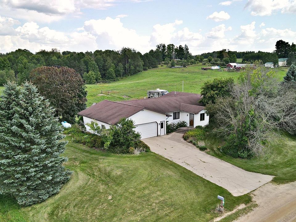 3 bedroom, 3 bath walkout ranch home on 3.2 acres with a 30 x 28 pole barn. On the main floor you will find an open floor plan in the kitchen, dining, family room, and living room areas. Flanking the living space is the master bedroom with large walk-in closet on one side and the other 2 bedrooms and a second bath on the opposite. Downstairs you have a possible 4th, non-conforming bedroom, a 3rd bathroom, an open living area and a second kitchenette area. The utility/laundry room has plenty of extra space for storage. There are hookups for laundry on the main level if you would rather have it on the main level. Additional unfinished basement storage space is located under the newer addition. From the kitchen/dining area, step onto the deck with elevated views of the back yard and field. Major addition in 2002. Walking distance to Leroy Elementary. Per seller, this would prohibit cannabis operations. Buyer to verify all information and measurements.